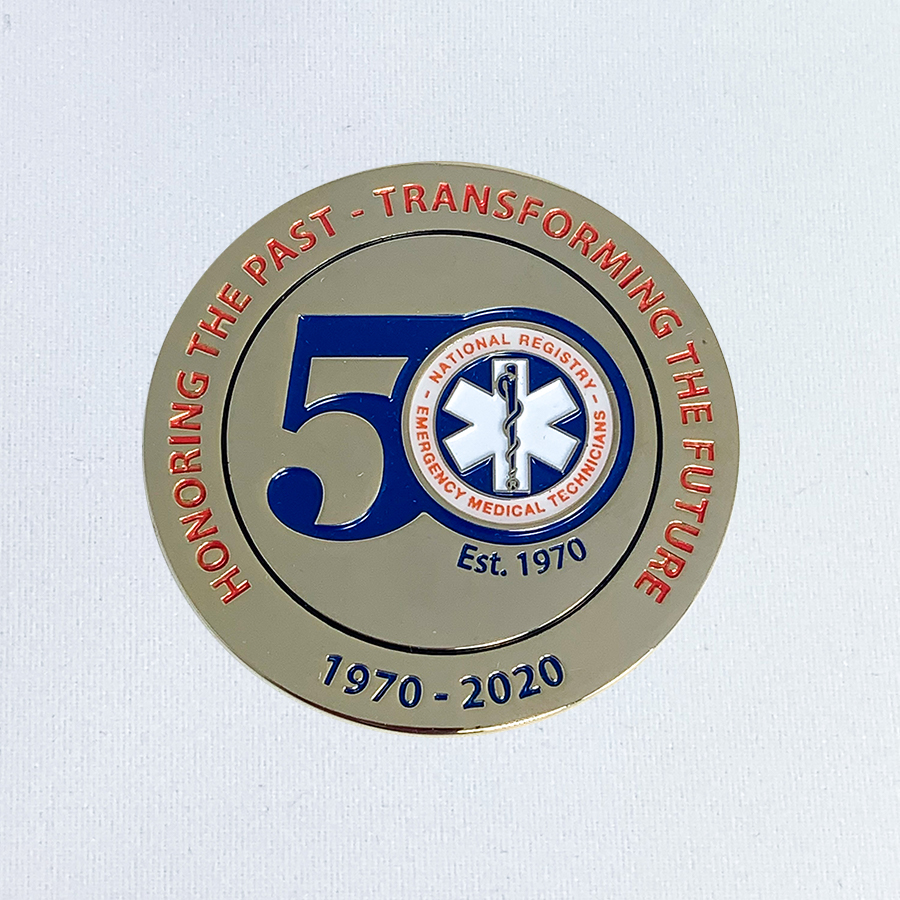 A must-have for any Nationally Registered Emergency Medical Service Provider or challenge coin collector. This beautifully crafted challenge coin celebrates the 50th Anniversary of the National Registry of EMTs (1970 to 2020), as well as the future of EMS. Measuring 2”, this is the official 50th Anniversary challenge coin from the National Registry of EMTs.