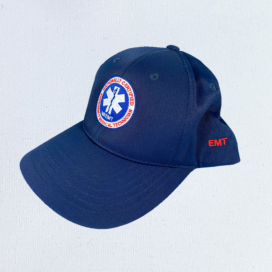 This blue adjustable quick-drying cap has a cooling sweatband and performs with moisture wicking technology. The cap features the National Registry’s EMT patch embroidered on the front and EMT embroidered in a contrasting color on the side. The fabric is 91% nylon with 9% cotton twill. The hook and loop adjustable band will ensure a perfect fit.